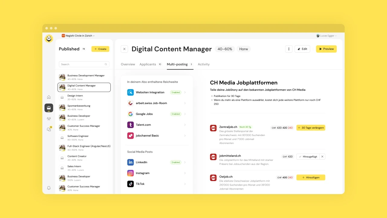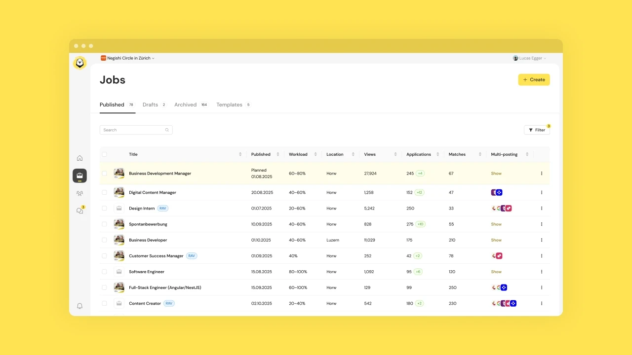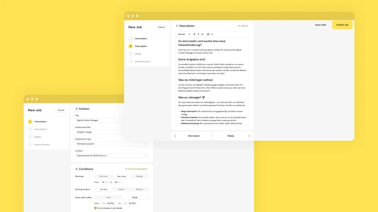 Jobeagle's applicant tracking software combines the two most important disciplines of sustainable recruitment: employer branding and recruiting. Dusty, generic text advertisements are replaced by authentic, video-based job stories. These offer applicants authentic insights into companies, teams and jobs. Thanks to smart multiposting functions, the advertisements are published on various job and social media platforms. An attractive candidate journey, combined with efficient applicant management, ensures sustainable recruiting success.